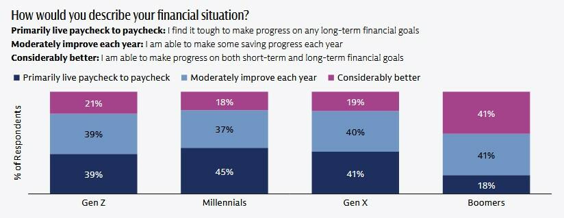 “For those living primarily paycheck to paycheck, the top issue cited by 87% of those asked was “Too many monthly financial expenses” - like an auto loan. In second place is financial hardship (81%) such as home repairs, followed by credit card debt (77%).